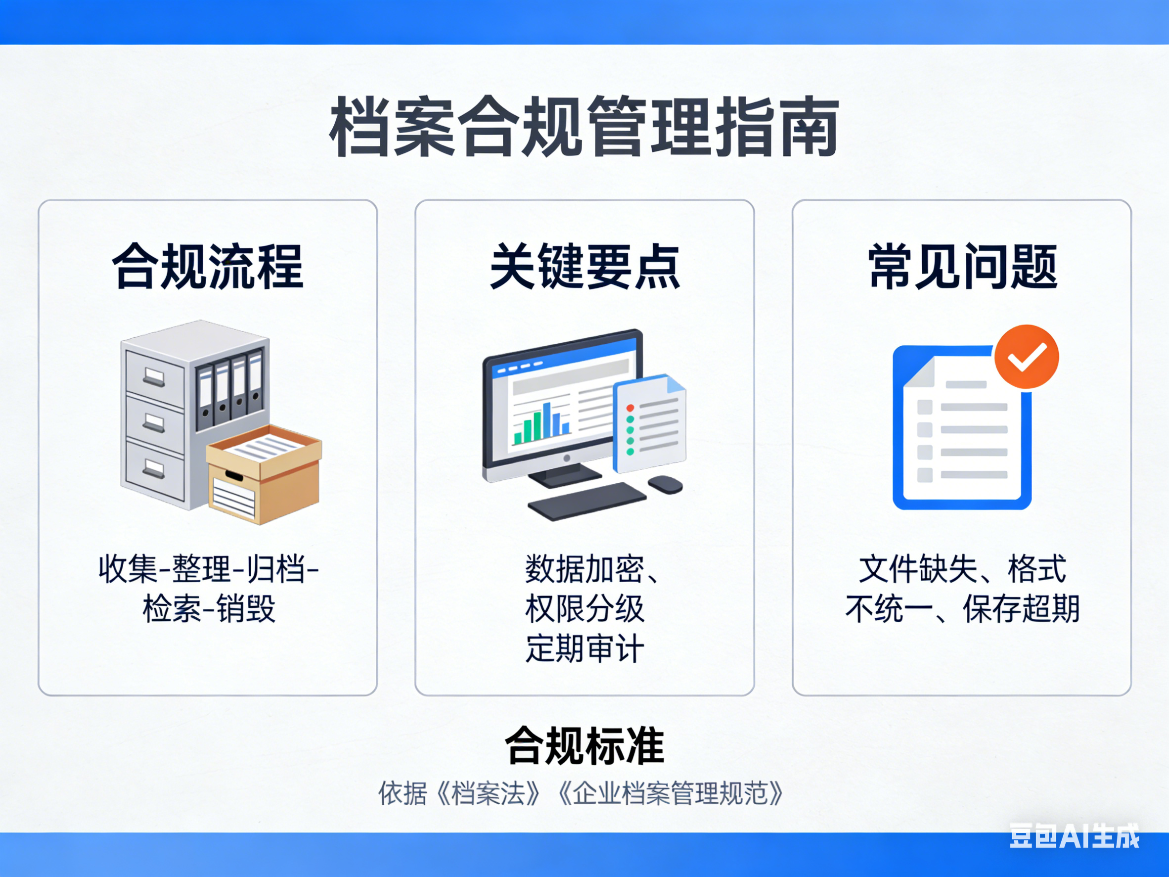 全流程业务合规:涵盖收集(是否应归尽归)、整理(分类编号规范)、保管(定期清点)、利用(手续齐全)等环节,文书档案需在年度结束后半年内归档。