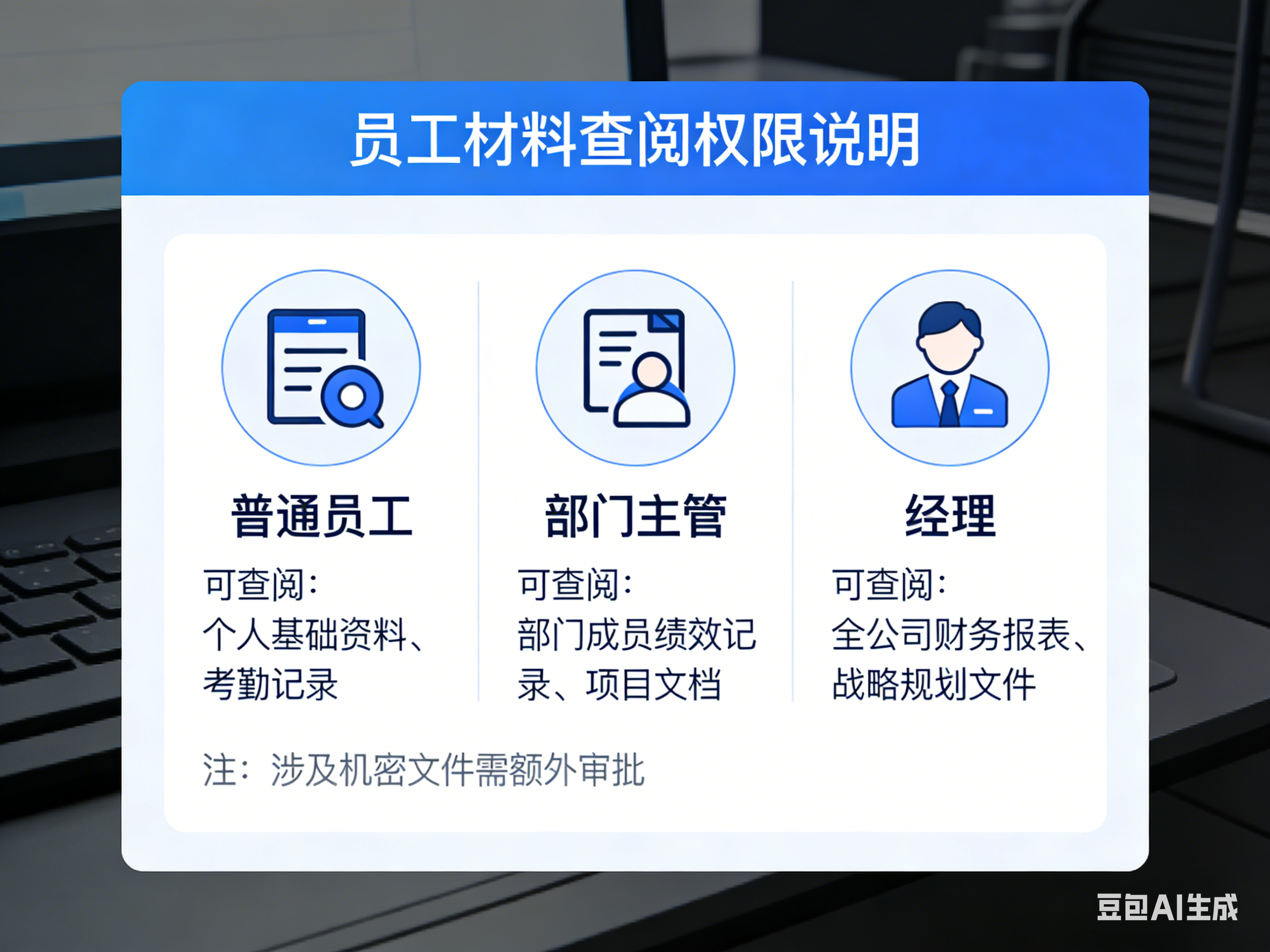 员工材料涉及个人隐私(如身份证、薪酬)与企业管理信息(如考核评价),需按“最小权限、分级授权”原则划分查阅权限,避免无序查阅导致信息泄露。