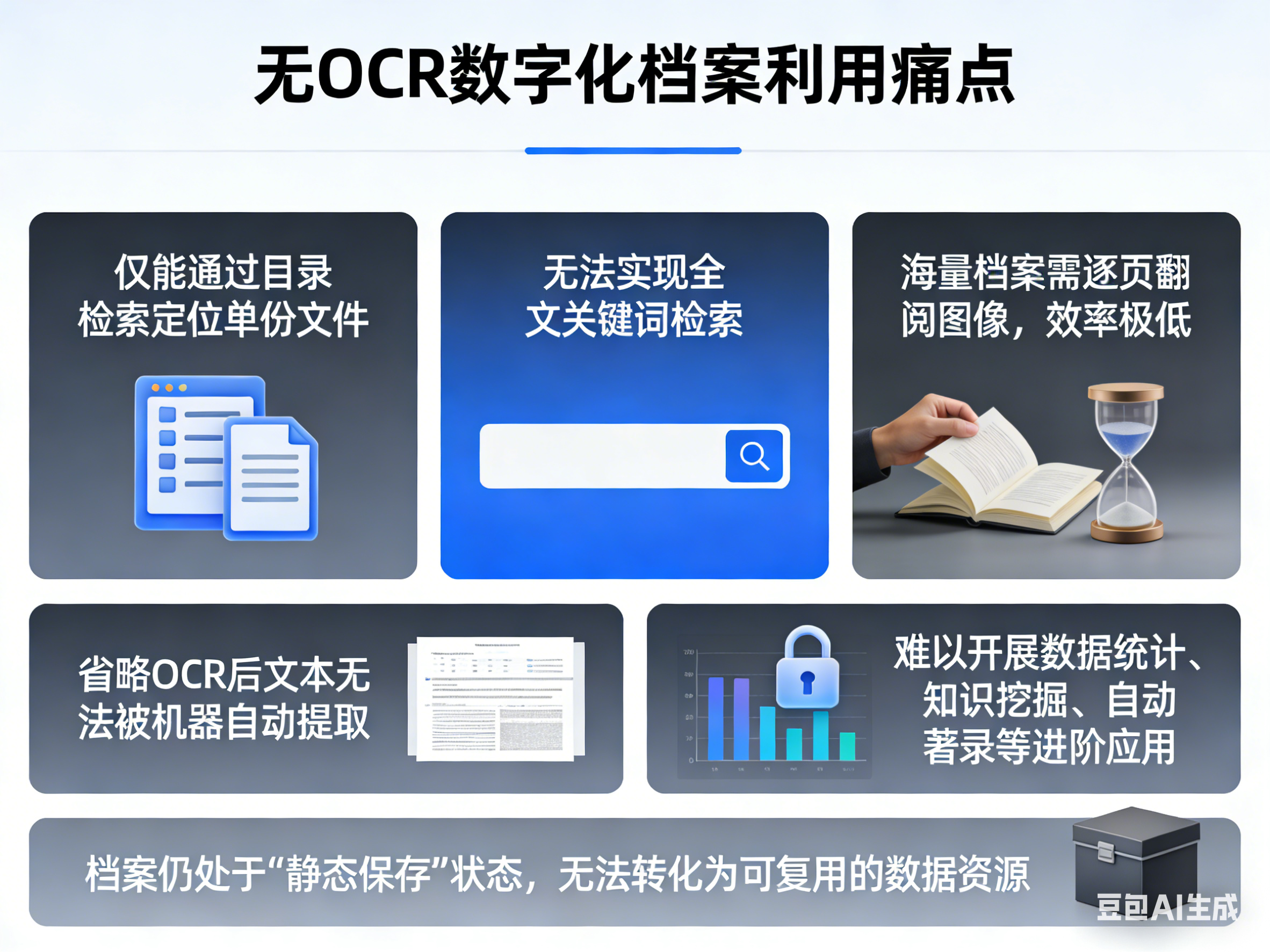 省略OCR后,档案文本无法被机器自动提取,难以开展数据统计、知识挖掘、自动著录等进阶应用,档案仍处于“静态保存”状态,无法转化为可复用的数据资源。