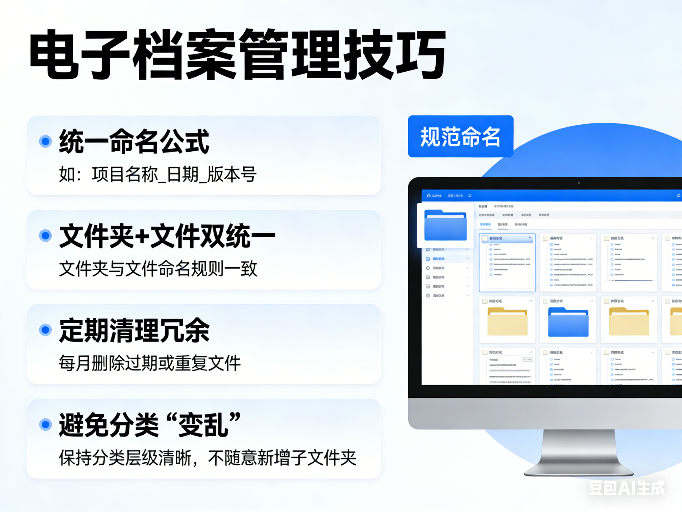 ① 文件夹命名:一级-二级-三级(比如“行政类-2026年-通知公告”);