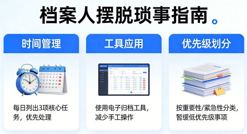 其实档案人每天多干的2小时,大多都耗在无关琐事、无效返工上,不是我们不够努力,是我们没找对方法——不会批量处理、不会借力工具、不会拒绝、流程混乱、冗余堆积,才被琐事缠得喘不过气。
