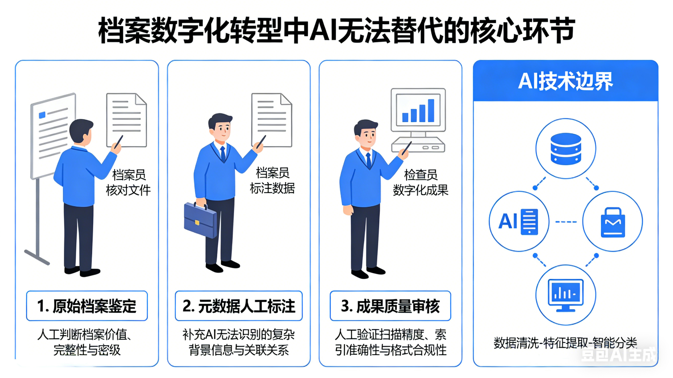 3. 责任承载:档案安全、合规、长期保存的最终责任,需人工承担,AI 无法承担法律与安全责任。