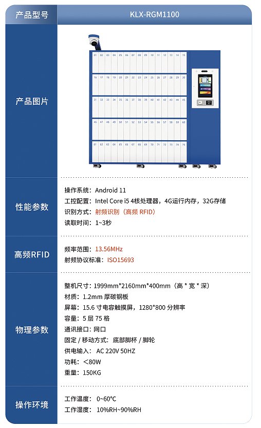 为此,我司全新推出KLX-RGM1100 RFID 智能案卷周转柜,深度融合高频 RFID 射频识别技术、智能工控系统与一体化管理平台,专为案卷流转、资料中转、文件借还场景量身打造,实现案卷预约存取、智能借还、专属格口防护、全程留痕溯源、实时安全监控、数据智能统计,为全行业案卷资料流转提供高效、安全、闭环的一体化智能解决方案。