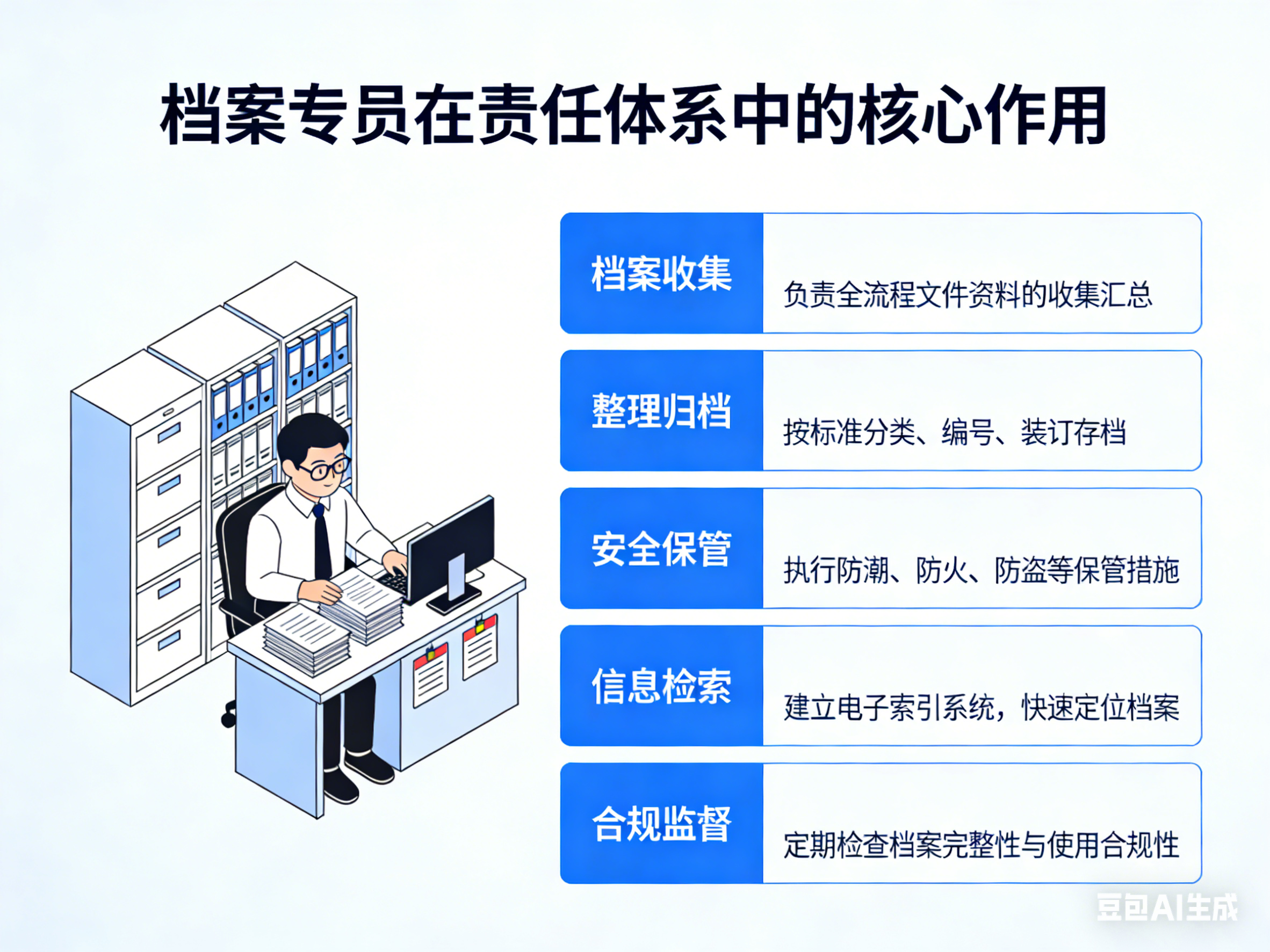查看详情档案专员是机关单位档案管理责任落实的“最后一公里”执行者,既是本部门档案收集、整理的直接责任人,也是连接业务部门与档案管理部门的关键纽带。明确各部门档案专员的职责 . . .